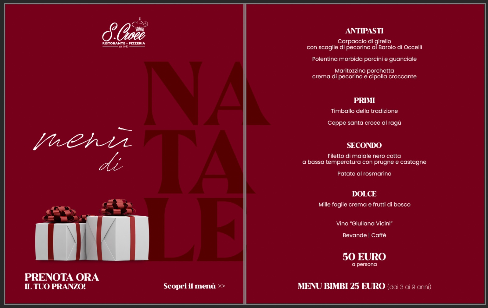 Lasciati avvolgere dal calore della tradizione e dai profumi autentici della nostra cucina. Abbiamo creato un menù che racconta i sapori di casa, da gustare in un’atmosfera accogliente e ricca di emozioni. Prenota il tuo posto a tavola e vivi con noi la magia del Natale… tra gusto, sorrisi e momenti da ricordare.